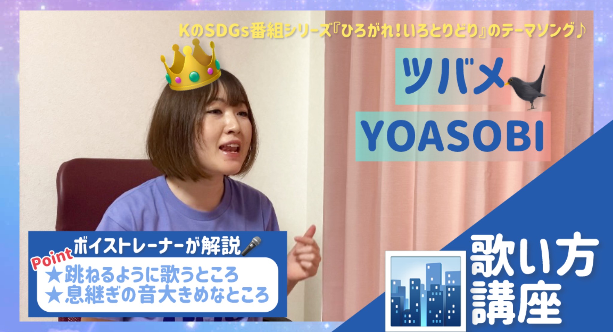 今回は、NHKの子ども向けSDGs番組シリーズ 『ひろがれ!いろとりどり』および『あおきいろ』のテーマソング♪ YOASOBIさんの「ツバメ」を上手に歌えるようになるコツを解説していきます! 【最初にポイントまとめ】 ★跳ねるように歌う ★息継ぎの音を大きめにさせるところ
